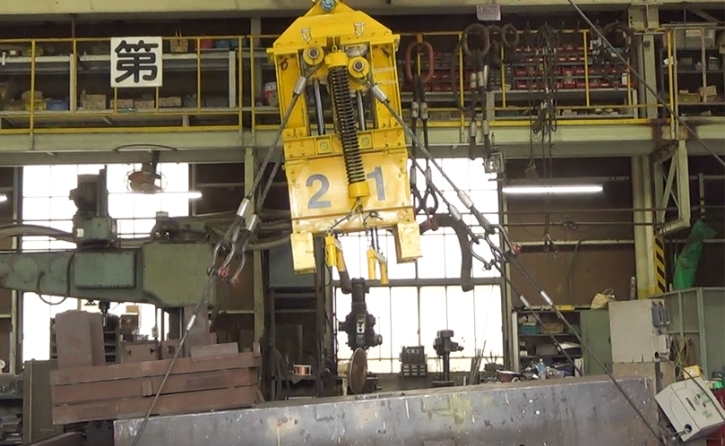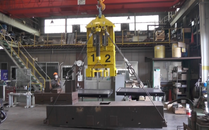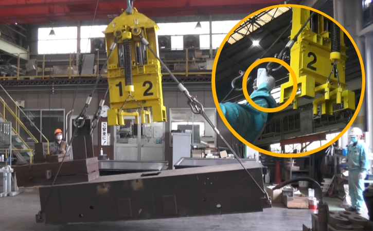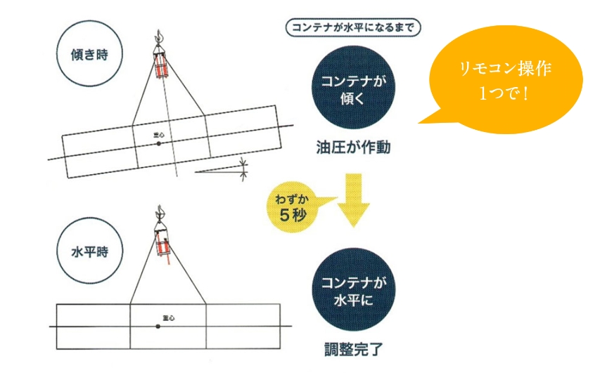 クレーンで荷物を吊る時、傾いた荷物を動力なしで、リモコン操作によって簡単に水平にする装置です。従来の荷役作業のように、試行錯誤しながらワイヤーの長さを調整して、水平にする必要はありません。荷物から離れて安全な場所から効率よく作業ができます。